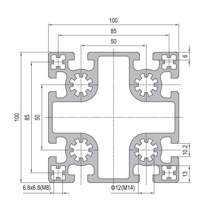 This industrial-grade 100x100mm aluminum profile frame is engineered for heavy-duty structural framing applications. As a professional aluminum profile framesupplier, we offer this robust solution for wholesaleB2B clients seeking reliable OEM aluminum profiles. Featuring eight precisely machined T-slots on all faces, it enables versatile, multi-axis component assembly and infinite modular configurations for various industrial uses. Manufactured from high-strength 6063-T5 aluminum alloy, it delivers exceptional rigidity while remaining lightweight, making it ideal for constructing durable frames, machine guards, workstations, and automation equipment.