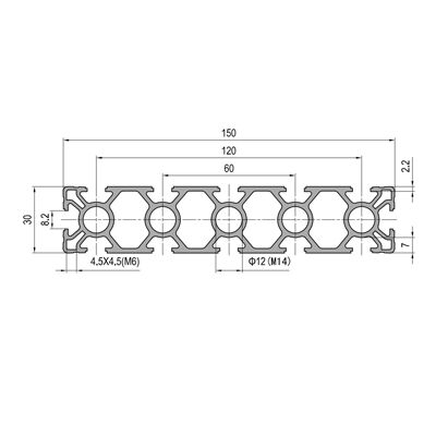 This 30mm x 150mm anodized aluminum extrusion profile is a heavy-duty structural component designed for industrial automation, robust framing, and modular construction. Manufactured from high-strength aluminum alloy, it features 12 precision T-slots along its length, enabling flexible and secure attachment of components. The anodized surface enhances its resistance to corrosion, wear, and environmental factors, ensuring durability and a sleek, professional appearance. Ideal for building machine frames, workstations, safety guards, and custom architectural structures, it offers an exceptional strength-to-weight ratio and is engineered for easy assembly and reconfiguration without welding.