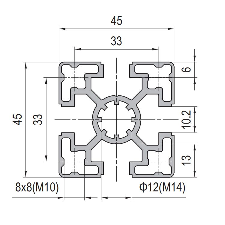 The 45×45 Aluminium Alloy Profile is a high-strength structural framing component crafted from 6000 series aluminum alloy. It is designed for constructing robust, modular frameworks in industrial automation, workstations, machinery guards, and architectural applications. Its square 45mm x 45mm cross-section with four integrated T-slots (typically 8mm or 10mm) on each face allows for immense design flexibility and easy assembly using standard connectors, eliminating the need for welding. The clear anodized finish enhances corrosion resistance and provides a durable, professional appearance. Offering an excellent strength-to-weight ratio (approx. 1.63 kg/m), this profile is ideal for building reusable, adaptable structures quickly and cost-effectively.