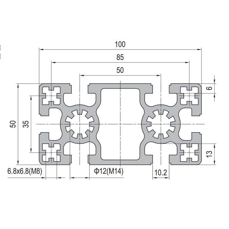 This 50×100 T-slot aluminum profile features six integrated T-slots, engineered for robust industrial framing systems. Constructed from high-strength 6063-T5 aluminum alloy, it offers an optimal balance of lightweight durability and structural integrity, making it ideal for machinery frames, workbenches, and automation equipment. The anodized finish ensures corrosion resistance, suitable for demanding environments. As a trusted