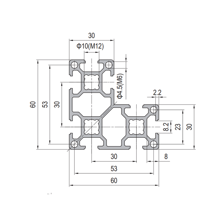 This 60×60 L-shaped aluminum extrusion profile features 8 integrated T-slots, engineered for versatile modular frameworks and industrial applications. Fabricated from 6060 aluminum alloy, it combines lightweight durability with high structural strength, suitable for constructing machine guards, workstations, conveyor systems, and storage solutions. The design enables easy assembly using M6 or M8 fasteners, reducing the need for welding and simplifying customization. As a bulk supplier, we ensure consistent quality and cost-effective pricing for large-scale projects.
